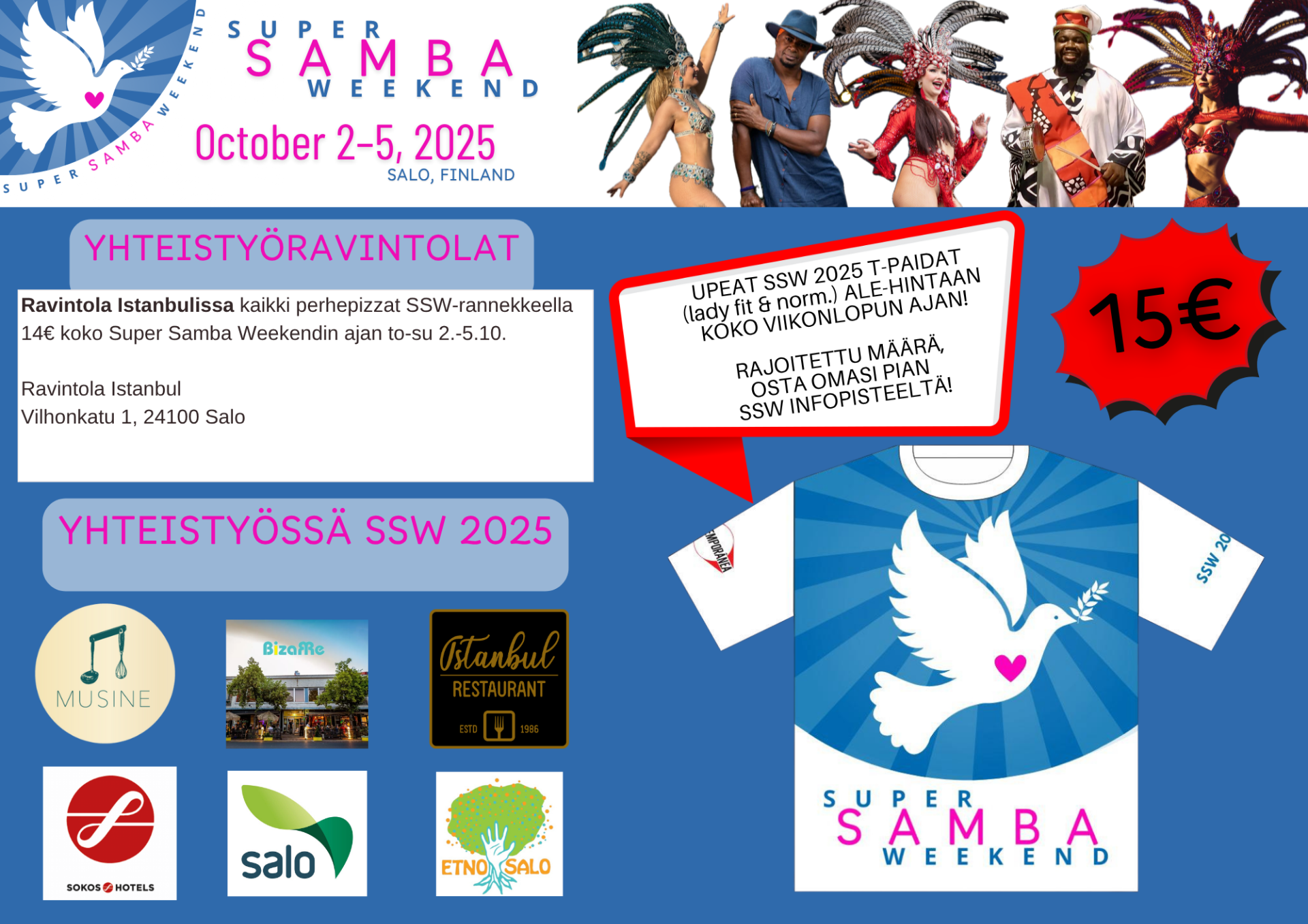 SSW Holvi-kaupasta ostetulla SSW 2025 festivaalipassilla pääset osallistumaan koko Super Samba Weekendin ohjelmaan 2-5-10.2025 tanssi- ja rumpuworkshopeista aina iltajuhlien huikeisiin live-esityksiin. Majoitus ja ruokailut ostettavissa erikseen. Iltajuhliin on ostettavissa lippuja myös erikseen Super Samba Weekendin Holvi-kaupassa.